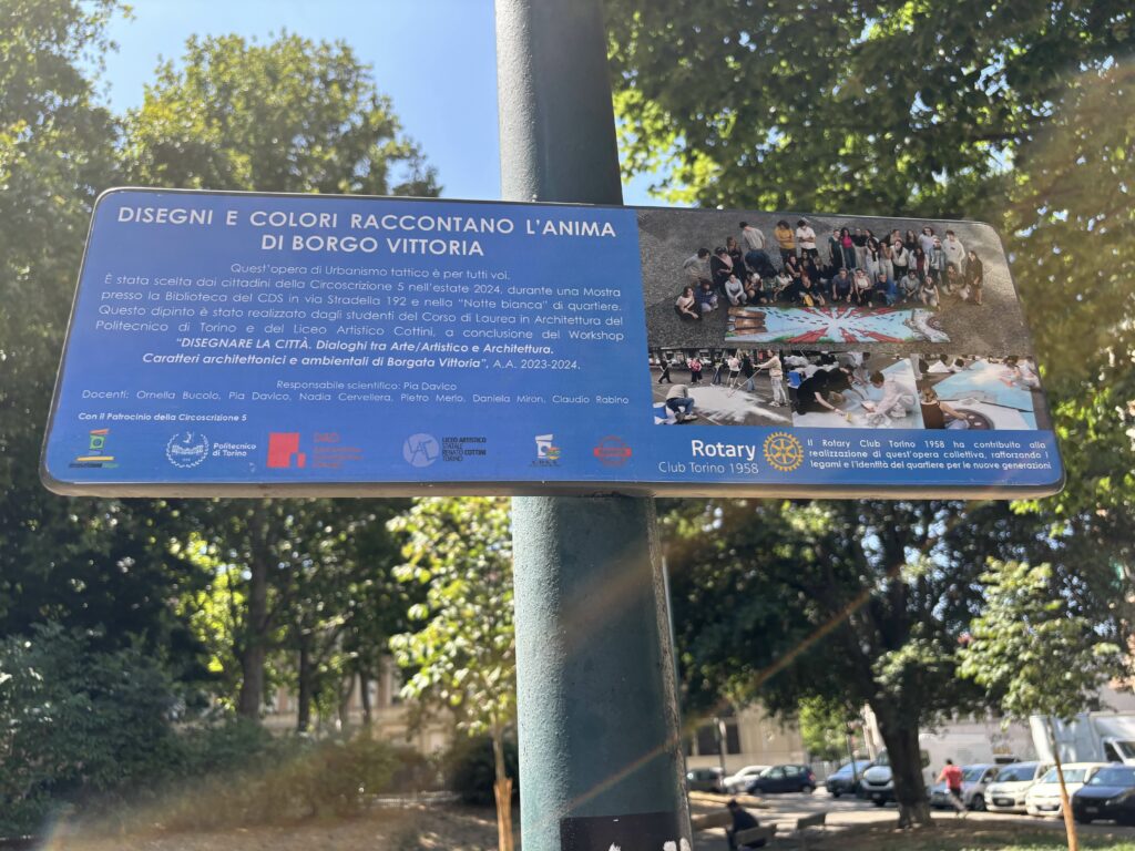 Un’esplosione di colori e creatività ha trasformato l’area pedonale del Giardino Giuseppe Allievo, grazie all’inaugurazione della nuova opera di urbanismo tattico “DISEGNI E COLORI RACCONTANO L’ANIMA DI BORGO VITTORIA”. Questo intervento, reso possibile anche dal sostegno economico del nostro Club — in continuità con il percorso “Rigenerare per generare responsabilità” avviato nel 2023 — rappresenta un esempio concreto di come la collaborazione tra enti pubblici, privati e la cittadinanza possa cambiare il volto di un quartiere. L’opera, realizzata dagli studenti del Corso di Laurea in Architettura del Politecnico di Torino e del Liceo Artistico Renato Cottini, ha preso vita a partire dal bozzetto vincitore del workshop “DISEGNARE LA CITTÀ – Dialoghi tra Arte/Artistico e Architettura”. Dopo essere stato scelto tra i progetti esposti alla cittadinanza durante la mostra presso la Biblioteca del CDS e durante la Notte Bianca di quartiere, il bozzetto è diventato uno spazio tangibile di bellezza e identità, pensato specialmente per i più giovani e per tutti coloro che vivono e animano la Borgata Vittoria.